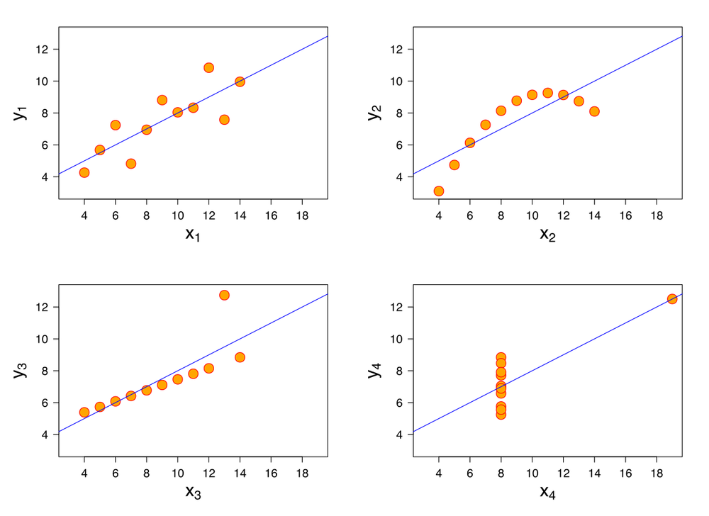 At first glance, these numbers suggest every dataset clusters neatly around a single straight line with a moderate spread. However, once you see each dataset plotted, you might notice some small inconsistencies in this hypothesis.